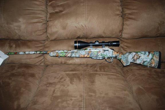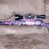 Tikka T3 in Ultimate Camo, turned horizontal to mimic oak limbs, complete with custom bolt and magazine.